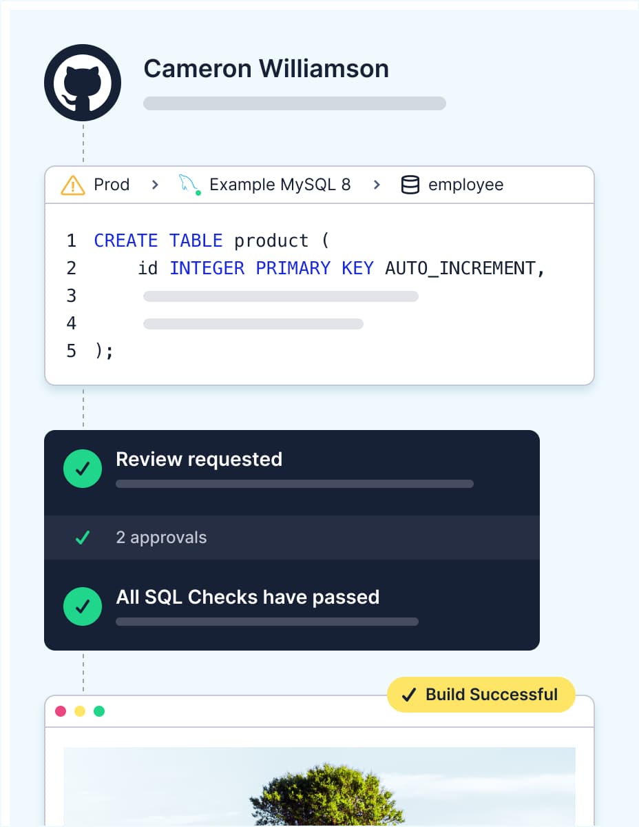 Bytebase streamlines database change deployment from non-prod to prod with review workflow, rollback, and optional GitOps integration.